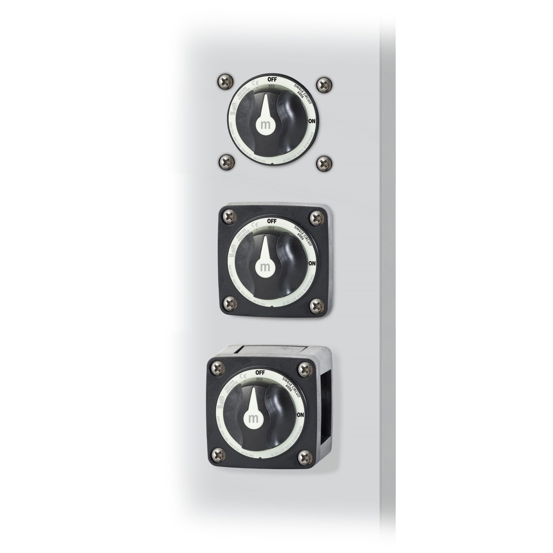 Single circuit On/Off battery switch rated for 300A. Switches a single battery or power source to a single load.