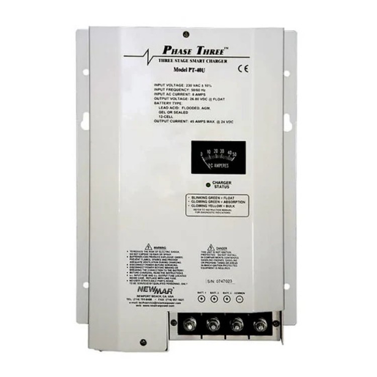 Newmar’s Phase Three Series Battery Chargers employ “Smart” battery charging technology for 12-volt systems aboard marine applications including workboats, military vessels, commercial vessels, and recreational craft. These chargers interact with batteries providing the optimum three stage charge process for fast recovery and conditioning, maximizing performance and extending battery life.