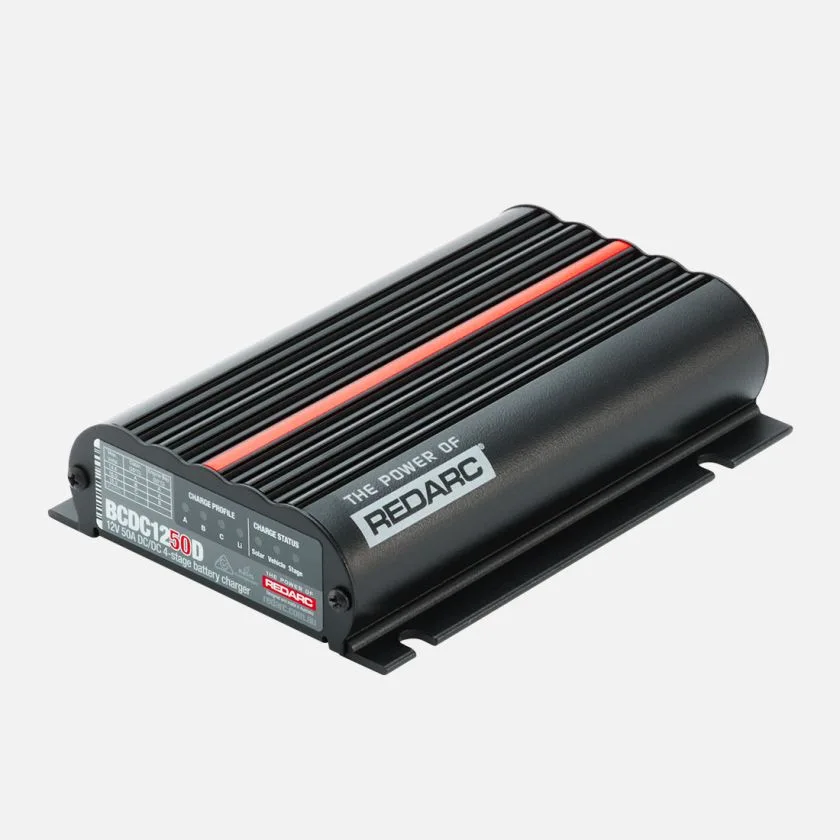 The REDARC BCDC1250D is a 12V, 50A In-vehicle DC to DC Battery Charger designed to keep your auxiliary battery charged when driving or with portable solar panels when parked. It uses multi-stage DC-DC charging, a system that allows optimum charging levels for your auxiliary battery. It is solar ready and suitable for many battery types including lithium, AGM, GEL, standard lead acid and calcium.